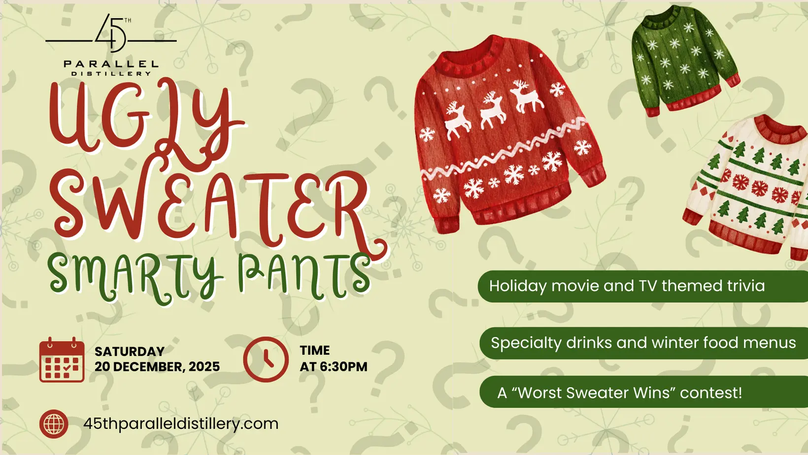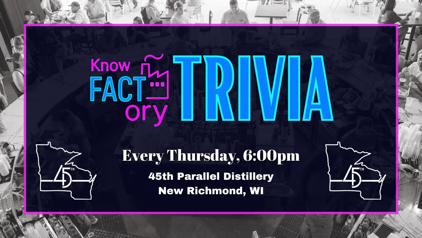 Grab your big-brain friends and join us at 45th Parallel Distillery every Thursday for drinks, off-menu specials, and TRIVIA!